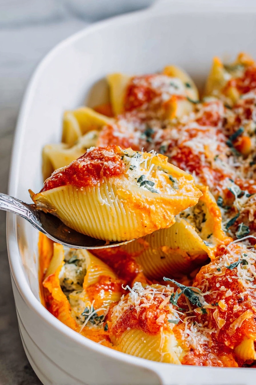 Spread about 3 cups of marinara on the bottom of a large baking dish—this keeps your pasta from sticking and adds a tangy base. Then, carefully stuff each shell with the pumpkin ricotta mixture, using a spoon or small scoop, and place them seam side up over the sauce. It’s a little fiddly at first, but once you get into the rhythm, it’s kinda fun. Finish by spooning the remaining marinara over the shells and sprinkle extra parmesan if you want that cheesy crust on top.