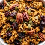 I store any leftover granola in an airtight container at room temperature and it usually keeps well for up to 3 weeks. Just know that because of the pumpkin puree, the crunch may soften slightly over time, but the flavor is still excellent. For me, it’s a skinny-bag-at-work or quick cereal fix when fresh isn’t on hand.