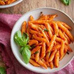 This Penne Pomodoro recipe is a classic Italian pasta dish featuring al dente penne pasta tossed in a simple yet flavorful tomato sauce made with pureed tomatoes, garlic, fresh herbs, and a touch of tomato paste. Garnished with fresh basil and Parmesan, it’s a quick and easy meal perfect for busy weeknights.