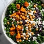 If you want warm leftovers, I reheat the roasted sweet potatoes and chickpeas separately in a hot skillet or oven and then toss them with fresh kale and dressing right before serving. This way, the kale stays fresh and doesn’t get mushy.