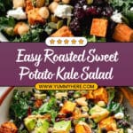 You can prepare most components ahead of time: roast sweet potatoes and chickpeas, wash and chop kale, and make the dressing. Combine and add toppings just before serving for the best texture and flavor.