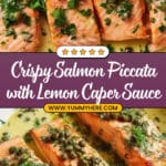 This Salmon Piccata recipe features tender, crispy seared salmon fillets served with a bright and flavorful lemon-caper butter sauce. The sauce is enriched with garlic, white wine, fresh herbs, and a touch of fresh lemon juice, creating a perfect balance of zesty and savory that elevates the rich salmon. Quick to prepare and impressive to serve, this dish is ideal for a weeknight dinner or a special occasion.