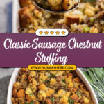 Sausage and Chestnut Stuffing is a hearty and flavorful holiday side dish that combines the comforting textures of toasted cornbread and white bread with savory Italian sausage, buttery chestnuts, and fresh herbs. Enhanced by apple cider and aromatic poultry seasoning, this baked stuffing is perfect alongside roasted turkey for festive meals and can be prepared ahead to ease your holiday cooking.
