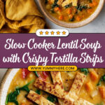 This slow cooker lentil soup is a hearty and nutritious meal, packed with a variety of vegetables, red lentils, and flavored with herbs and spices. It’s easy to prepare and perfect for a comforting lunch or dinner. Topped with crispy homemade tortilla strips and melted cheddar cheese, this soup offers a pleasant combination of creamy and crunchy textures.