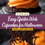 - Spider Web Cupcakes made with cake mix, orange frosting, and black frosting.