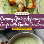 A creamy and vibrant Spring Asparagus Soup made with fresh asparagus, sautéed onions, and a velvety blend of heavy cream and vegetable stock. This easy stovetop soup is thickened with a roux, blended until smooth, and garnished with Parmesan cheese shavings and crispy homemade garlic croutons, perfect as a light vegetarian starter or a comforting meal during spring.