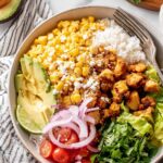- Assemble the Bowls: Divide the cilantro lime rice into four bowls. Top each bowl with cooked chicken, creamy Mexican street corn, and your choice of additional toppings such as lettuce, pico de gallo, onions, jalapeno, diced avocado, and tortilla chips.