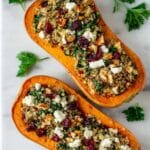 This delicious Stuffed Butternut Squash recipe combines roasted butternut squash halves filled with a savory mixture of spicy breakfast sausage, sautéed garlic, onions, cremini mushrooms, fresh herbs, kale, brown rice, and melted gruyere cheese. Topped with parmesan and fresh parsley, it’s a comforting and hearty dish perfect as a main course or a festive side.