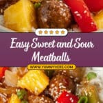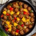Sweet and Sour Meatballs with Pineapple is a quick and flavorful dish that combines tender frozen meatballs with a tangy and sweet sauce made from brown sugar, apple cider vinegar, ketchup, soy sauce, and Worcestershire sauce. Enhanced with colorful bell peppers, onions, and pineapple chunks, this skillet meal is perfect for a fast weeknight dinner served over rice and garnished with sesame seeds.