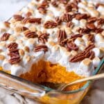 - Add Toppings: Sprinkle the miniature marshmallows evenly over the sweet potato layer, then top with the remaining chopped pecans.