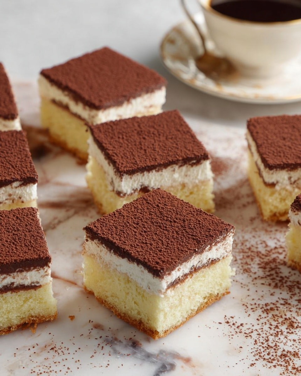 This Tiramisu Cake is a delightful twist on the classic Italian dessert, featuring layers of vanilla and coffee-flavored cake batters swirled together and baked to perfection. A coffee soak infuses the cake with rich espresso notes, topped with a luscious cream mixture of whipped cream and sour cream, then dusted generously with cocoa powder. It’s a perfect treat for coffee lovers looking for a moist, flavorful cake inspired by traditional tiramisu.