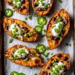 - Garnish and Serve: Remove the stuffed sweet potatoes from the oven. Spoon a dollop of the honey-lime chipotle yogurt sauce on top of each stuffed skin. Garnish with diced green onions, jalapeño slices, fresh cilantro, and optional chopped cooked bacon. Serve immediately for the best texture and flavor, or cover and refrigerate for up to 5-7 days.