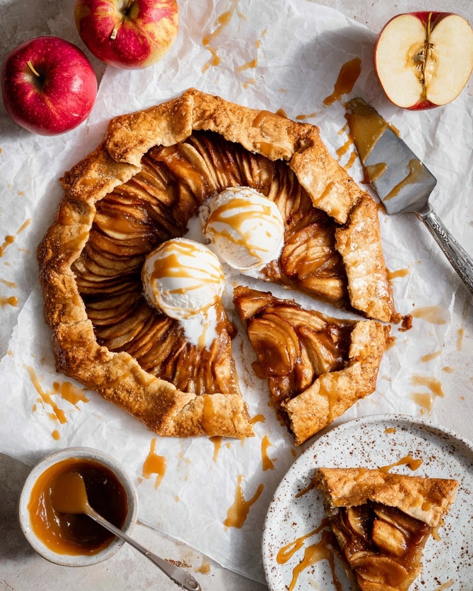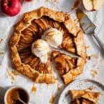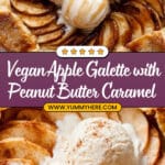 This Vegan Apple Galette with Peanut Butter Caramel is a rustic, flaky pastry filled with cinnamon-spiced Honeycrisp apples and topped with a luscious vegan peanut butter caramel sauce. Perfectly golden and flaky, the galette is enhanced with a sprinkle of turbinado sugar for crunch and served alongside vegan vanilla ice cream for a delightful plant-based dessert.