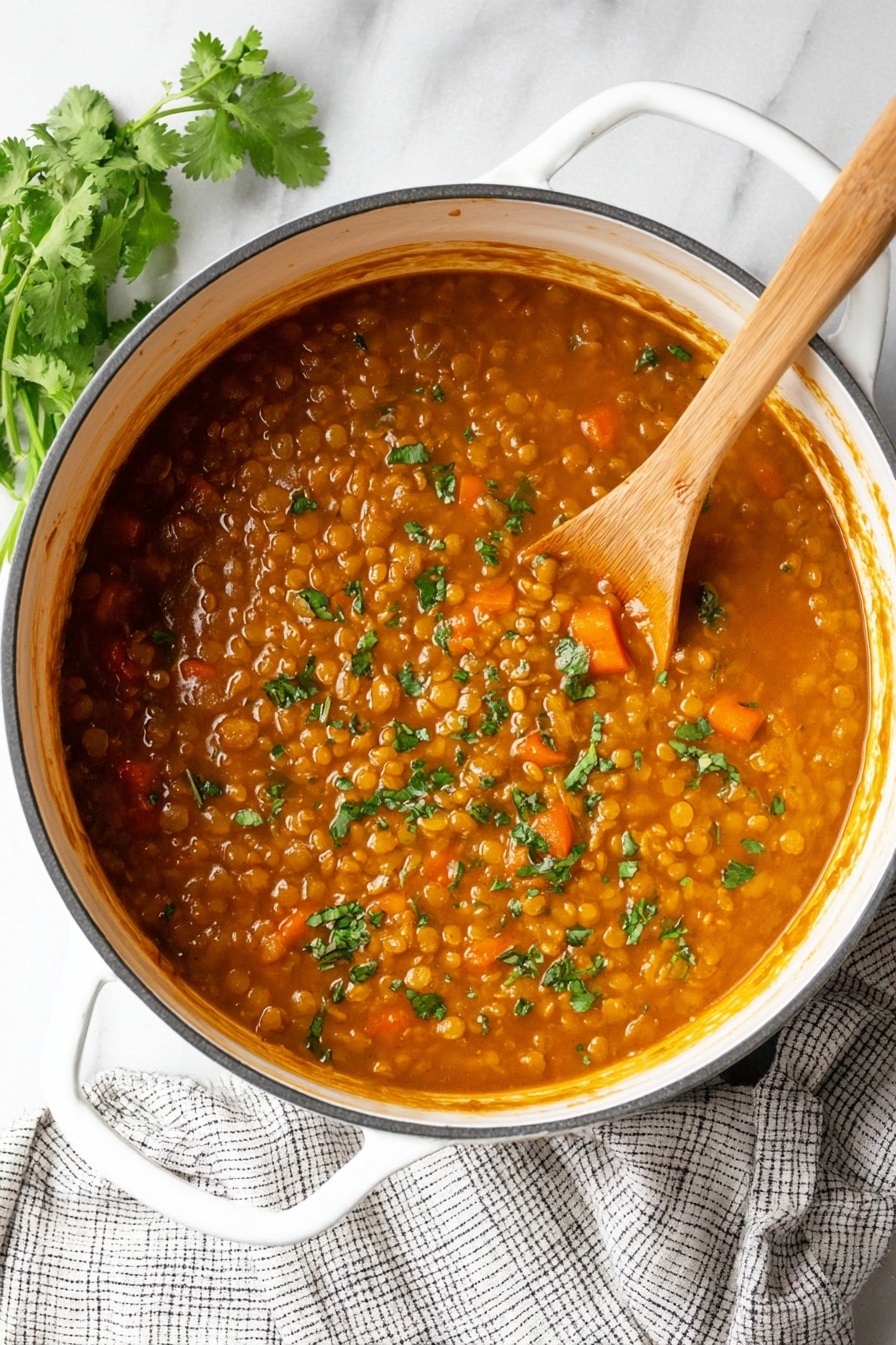 Bring the soup to a boil, then reduce the heat to medium-low to maintain a gentle simmer. Let it cook uncovered for about 30 minutes until lentils are soft and the soup thickens. If you prefer a thinner consistency, I’ve found adding an extra ½ to 1 cup of water or broth during cooking works perfectly. Taste and adjust seasoning—sometimes a little extra salt or pepper really wakes up the flavors.