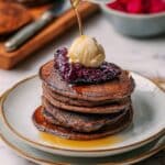 I usually serve these pancakes with a side of crispy vegan bacon or some sautéed mushrooms for a savory counterbalance. If you prefer to keep it fully sweet, a bowl of tropical fruit salad really completes the meal nicely.