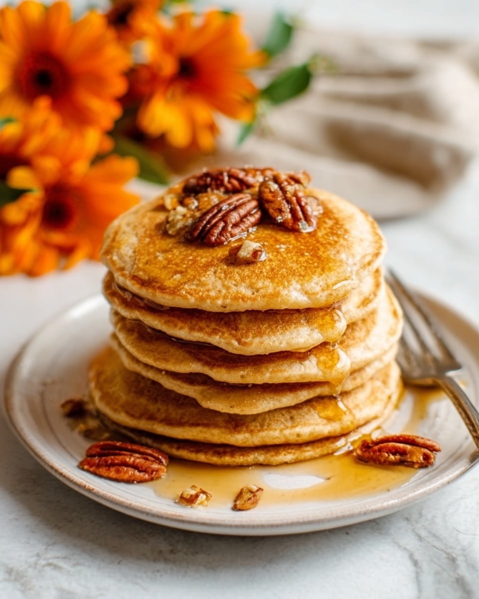 My go-to garnish is a generous drizzle of warmed pure maple syrup—it’s cozy and sweet without overpowering the pancakes’ spice. Sometimes, I add a pat of melting butter or a sprinkle of extra chopped pecans on top to amp up the texture and richness.